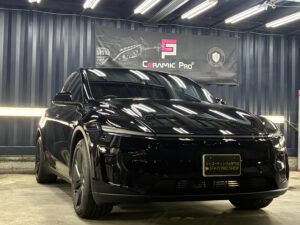 テスラ モデルY(新車・ブラック)ガラスコーティング施工事例 新車でご納車されたばかりのテスラ モデルYにお乗りのお客様より、「塗装面をしっかり保護し、日々のお手入れを楽にしたい」とのご相談をいただ...