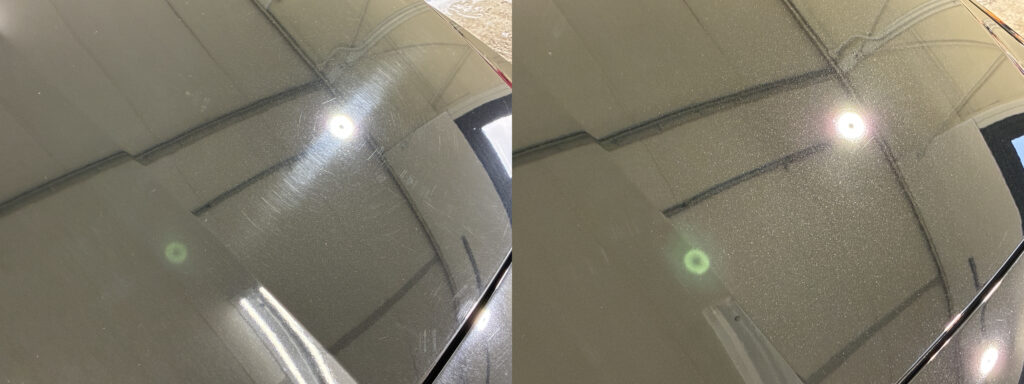 その後、塗装状態に合わせて下地磨きを実施。経年による細かな洗車傷や艶引けを整えることで、濃色特有のぼやけた印象を改善し、塗装本来の深みを引き出しています。
